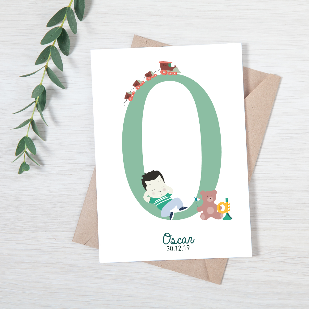Découvrez notre faire-part avec la première lettre du prénom du nouveau né, idéal pour annoncer la naissance d’un petit garçon
